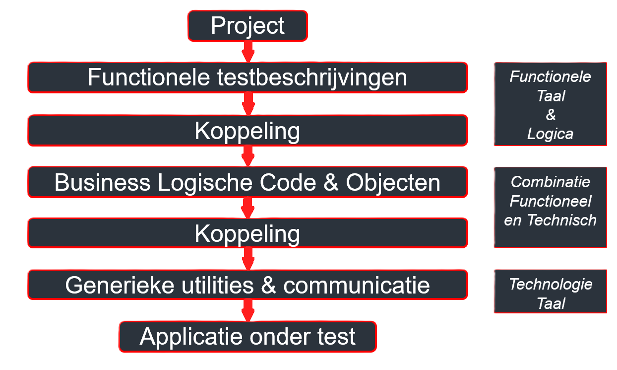 Een goed testautomatisering framework bevat code op meerdere lagen. Elke laag heeft haar functie en de lagen zouden idealiter niet in elkaar over moeten lopen. In elke laag bestaat code die herbruikbaar is over meerdere testen heen.